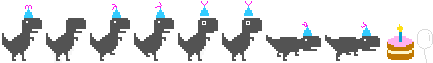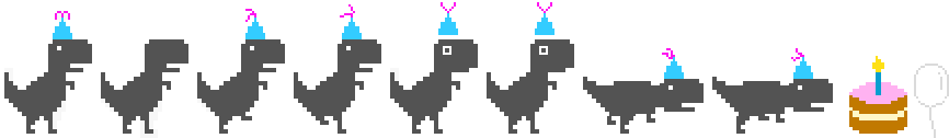 نسخة احتفالية من لعبة الديناصور الكلاسيكية — كعكة عيد ميلاد، قبعات حفلات، وبالونات — صُمِّمت بمناسبة الذكرى العاشرة لـ Chrome.